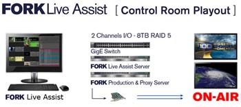 FORK Live Assist module enables operators to easily push content directly to air or live presentation using an attractive, user-friendly interface that can also be controlled from external USB control surfaces, or even GPO enabled production switcher, allowing complete integration into existing controls rooms. Options include loop, sync roll, hold on last frame and play- through, ensuring broadcasts or presentations never go to black. Live Assist is fully integrated with industry-standard newsroom systems such as iNEWS, ENPS, and OCTOPUS. This integration allows for importing of rundowns of entire shows created by producers in a Newsroom Control System (NRCS), including placeholder clips of items yet to be edited. Live updates of the rundowns can be managed from the NRCS or the Live Assist operator can take local control. Multiple playout channels in Live Assist can also be used to push content (such as graphic loops) to studio monitors for a rich production look.
